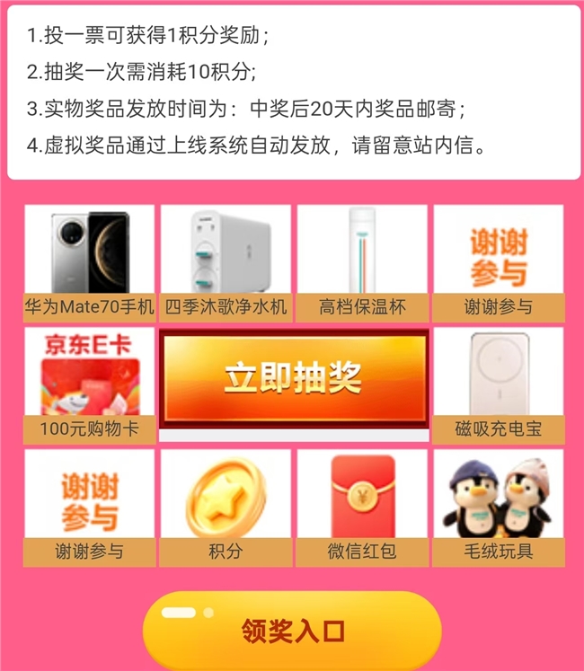 这意味着,只要你为报名成功的新人投票,即可积累积分参与抽奖,有机会将心动大奖带回家。华为Mate70 Pro作为当下极具热度的高端智能手机,是许多人心中的梦想机型,无论是日常使用还是记录生活的美好瞬间都能让人心动不已;备受喜爱的四季沐歌净水机,则为人们的日常生活送上一份健康保障,让健康好水时刻相伴;百元京东E卡实用性极高,可以让你自由选购心仪的商品;此外,还有小巧便捷的磁吸充电宝、温暖实用的保温杯、以及精致可爱的四季沐歌定制毛绒玩具和微信红包福利。